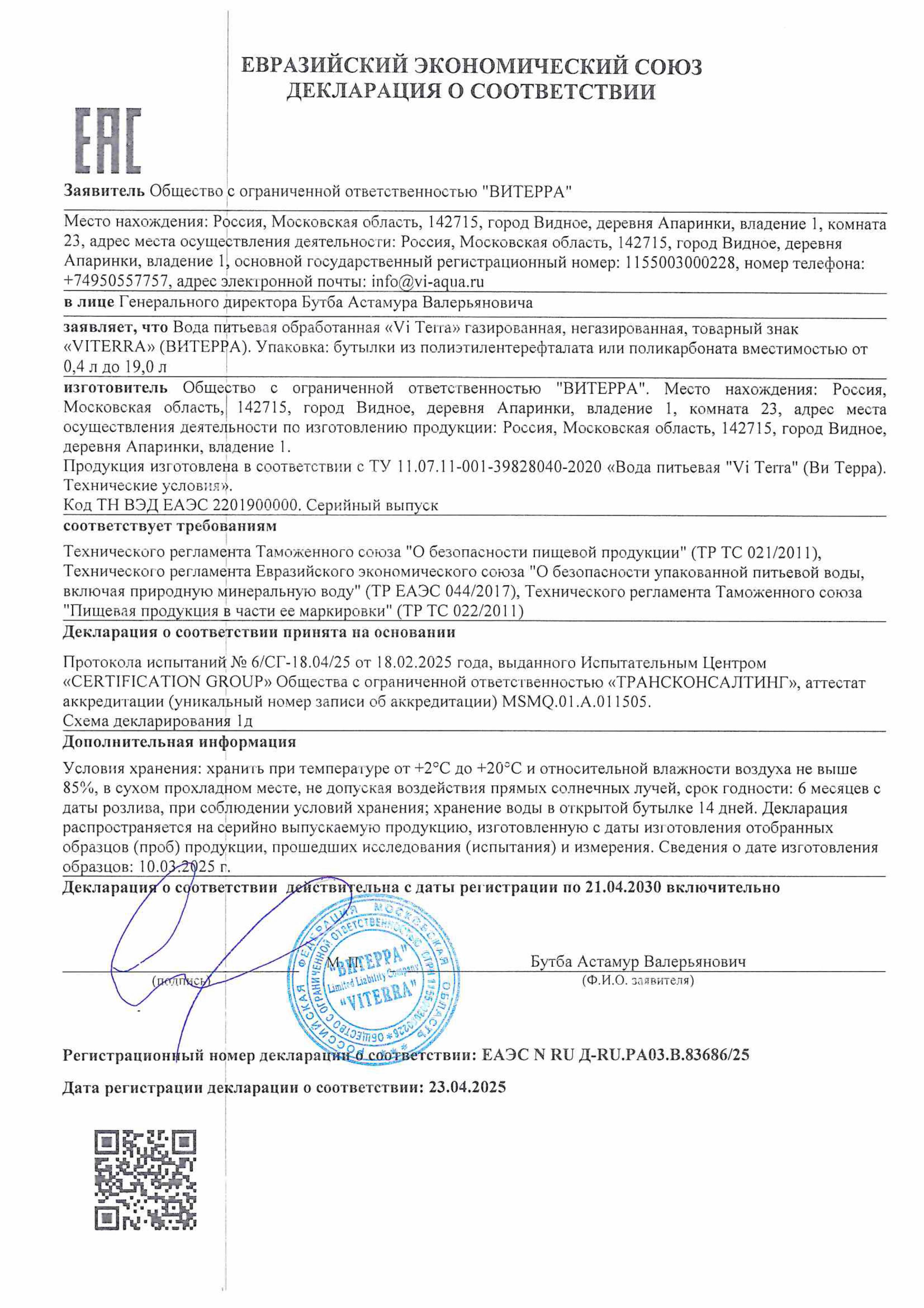 Протокола испытаний № б/СГ- 18.04/25 от 1 8.02.2025 года, выданного Испытательным Центром